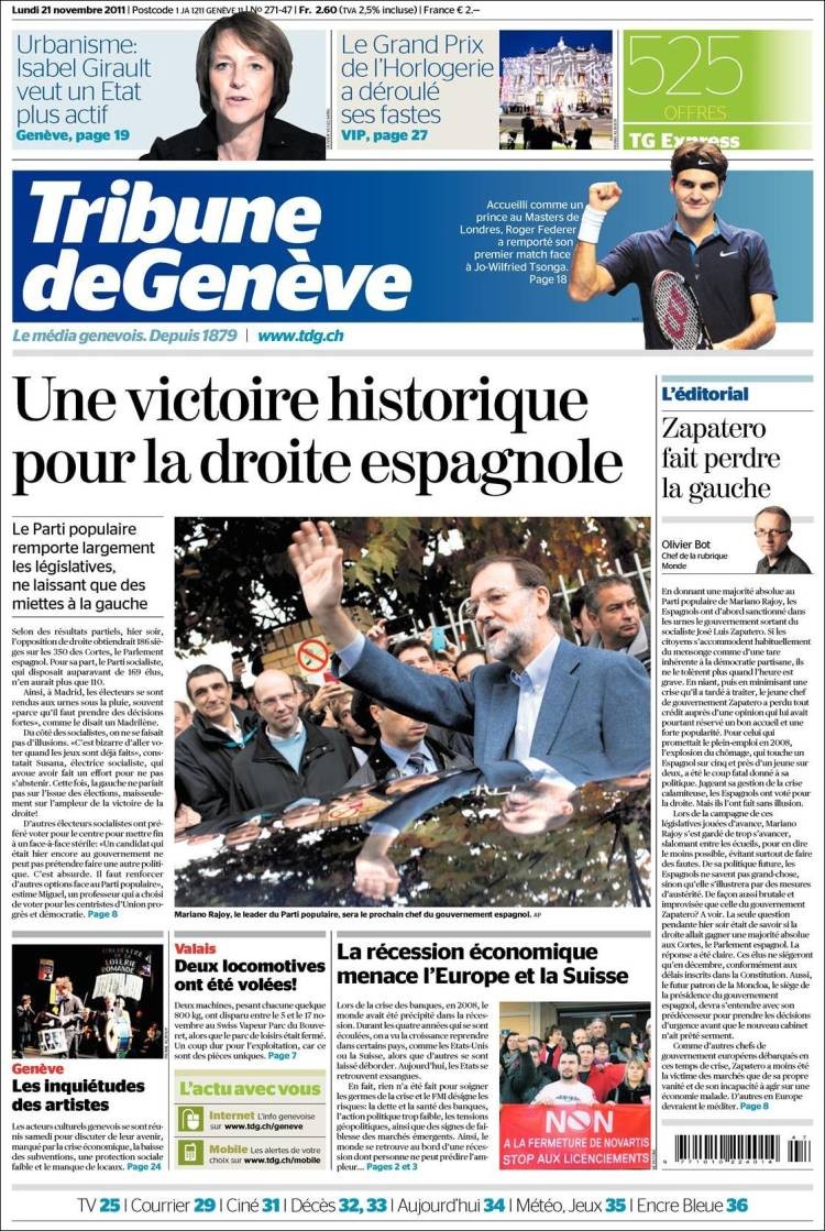 Este diario suizo titula: "Una victoria histórica para la derecha española". Aparece Mariano Rajoy saludando a simpatizantes del PP.