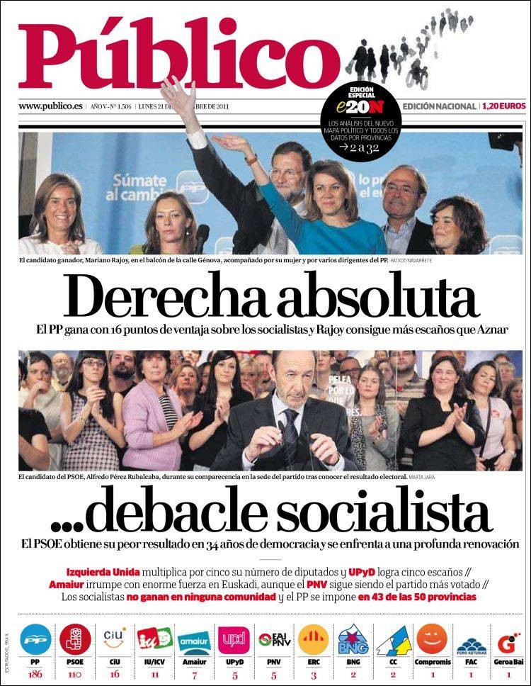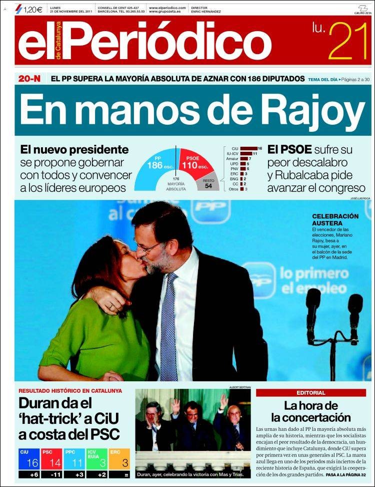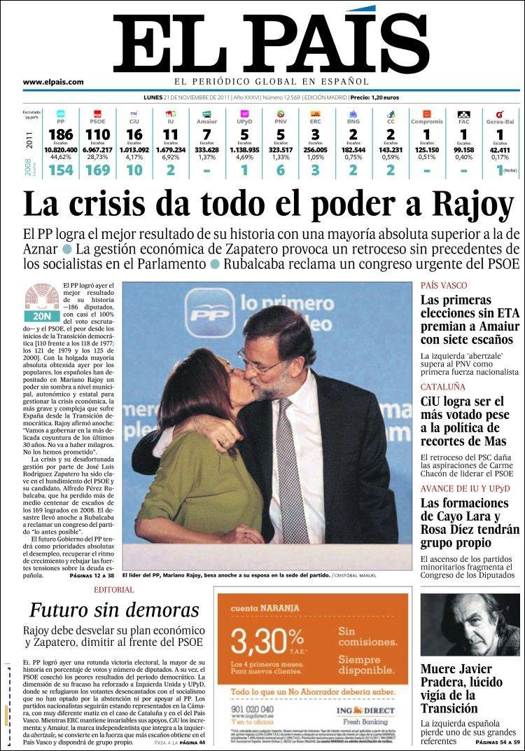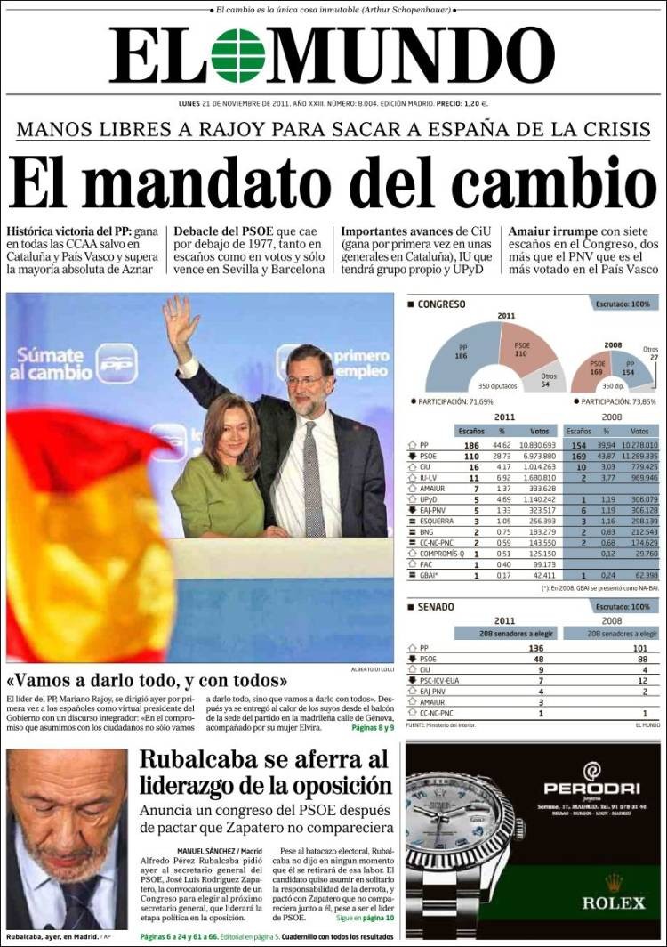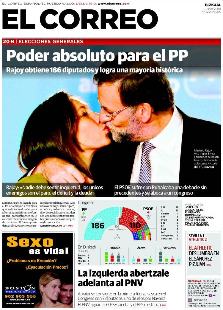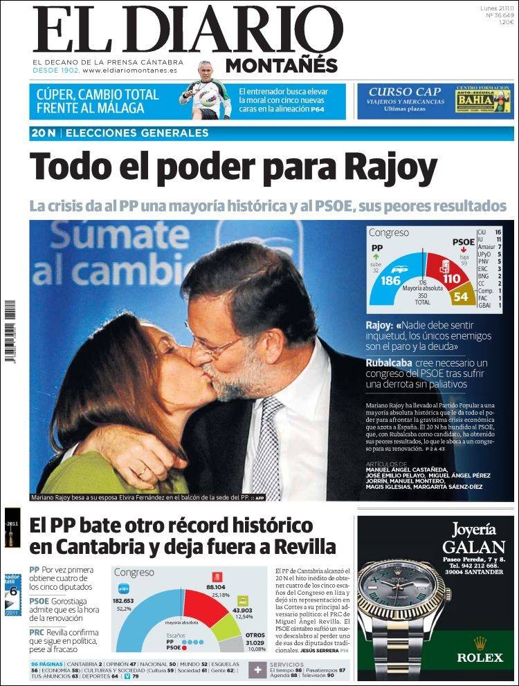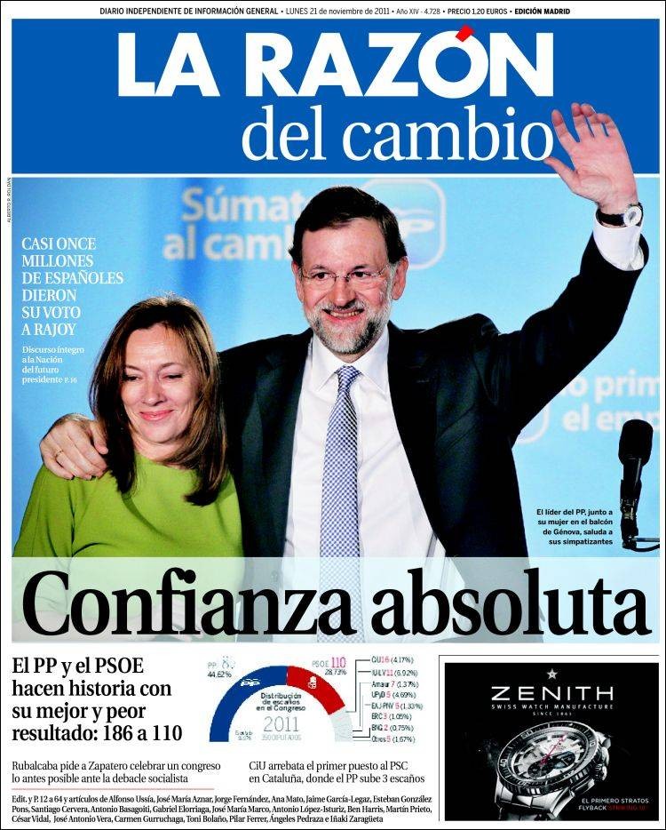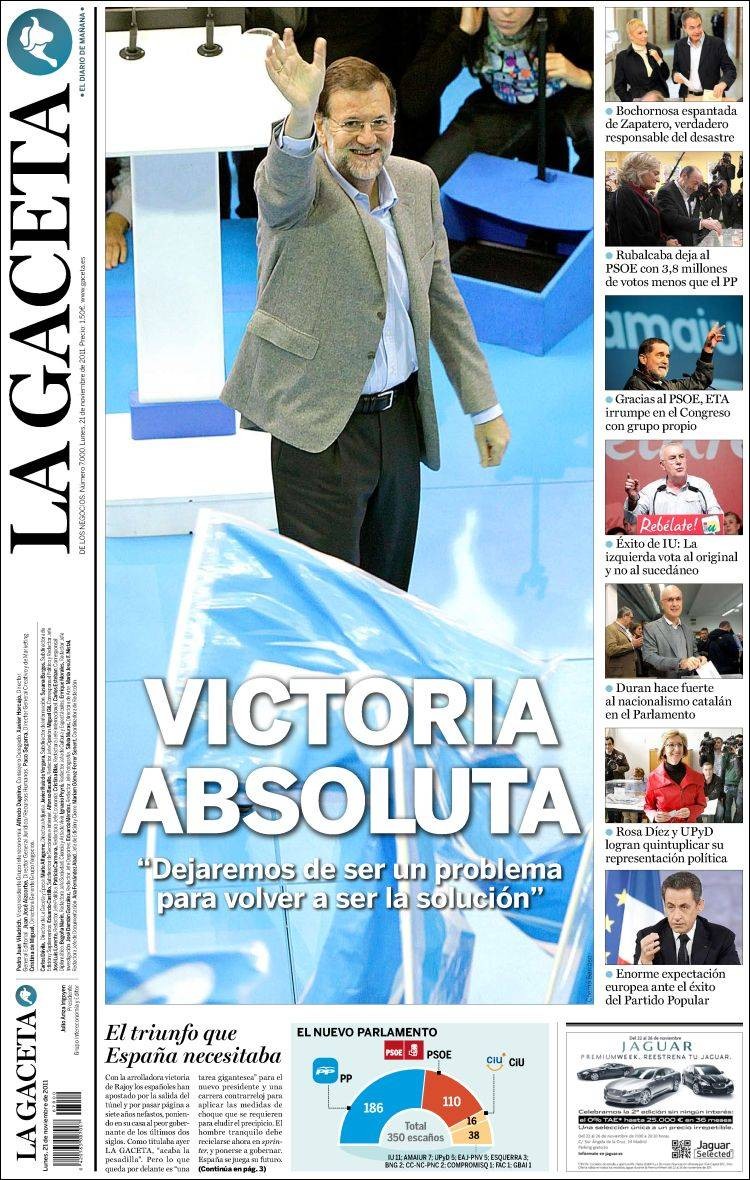 Los diarios españoles dedican su portada completa al histórico triunfo del Partido Popular en las elecciones.