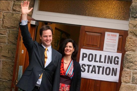 El líder del Partido Liberal Demócrata británico, Nick Clegg, y su esposa Míriam González, tras salir de votar