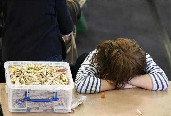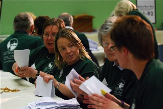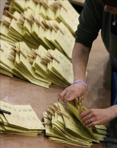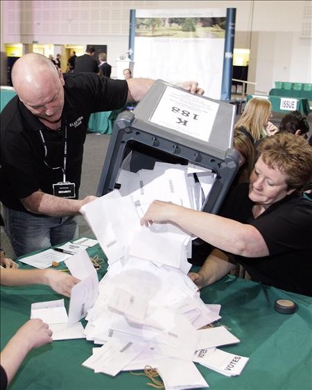 Jueces electorales cuentan votos durante la jornada de elecciones generales que vive el país hoy, jueves, 6 de mayo de 2010, en el Ponds Forge Arena, Sheffield