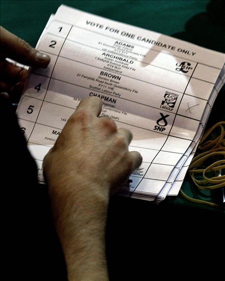 El contador observa uno de los votos que va dirigido al laborista Gordon Brown