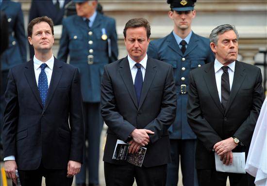Nick Clegg, David Cameron, y el primer ministro británico Gordon Brown, participan en el acto celebrado en Londres en conmemoración del 65 aniversario del final en Europa de la II Guerra Mundial