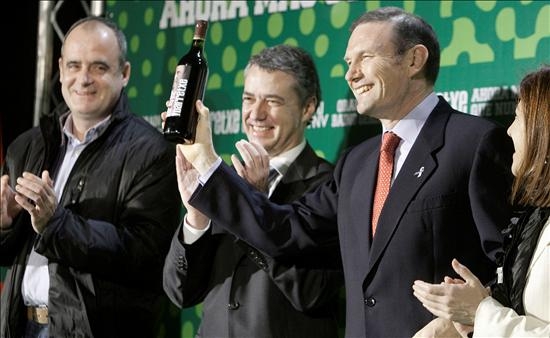 El lehendakari y candidato a la reelección por el PNV, Juan José Ibarretxe, acompañado por el presidente del partido Íñigo Urkullu (c) y el portavoz Joseba Egibar (i), enseña una botella de vino 'Viña Ibarretxe' obsequiado por su compañero de lista Mikel Martínez, durante el acto de inicio de campaña que se celebra esta noche en Vitoria. (EFE/David Aguilar)