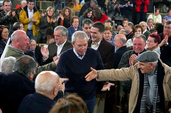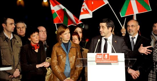 El candidato a Lehendakari por el PSE Patxi López (2d), acompañado por la secretaria de Organización del PSOE Leire Pajín (3i) y otros dirigentes socialistas, en un momento de su discurso durante la celebración esta noche en Bilbao del inicio de la campaña electoral para los comicios autonómicos vascos. (EFE/Miguel Toña)