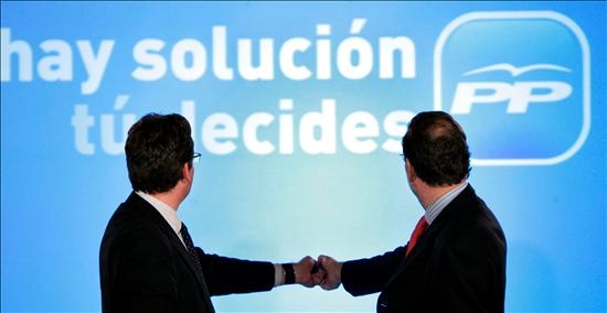 El presidente del PP, Mariano Rajoy (d), junto al presidente del PP del País Vasco y candidato a lehendakari, Antonio Basagoiti, durante la celebración esta noche en Bilbao del inicio de la campaña electoral para los comicios autonómicos vascos. (EFE/Alfredo Aldai)