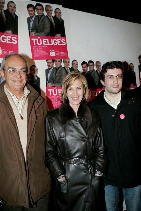 La presidenta de UPyD, Rosa Díez (c), posa con miembros de su candidatura gallega delante del Parlamento de Galicia durante la tradicional pega de carteles con la que comienza la campaña electoral, esta noche, en Santiago de Compostela. (EFE/X. Rey)
