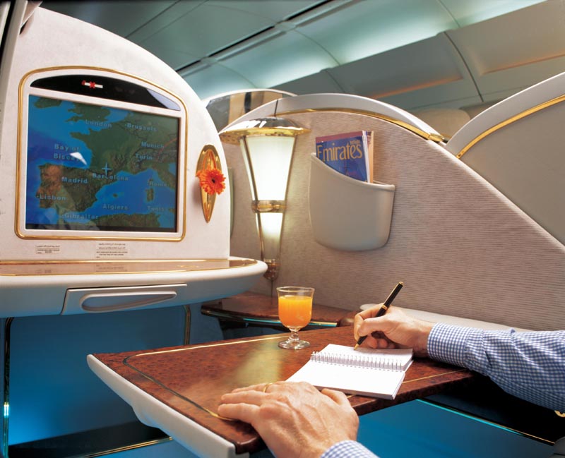 Algunas de las innovaciones pioneras de Emirates incluyen el hecho de ser la primera aerolínea en introducir pantallas individuales en los respaldos de los asientos y en permitir a los pasajeros realizar llamadas autorizadas a bordo desde los teléfonos móviles.
