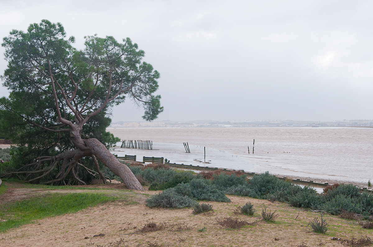 Un pino de sorprendente forma parece tumbarse junto al río