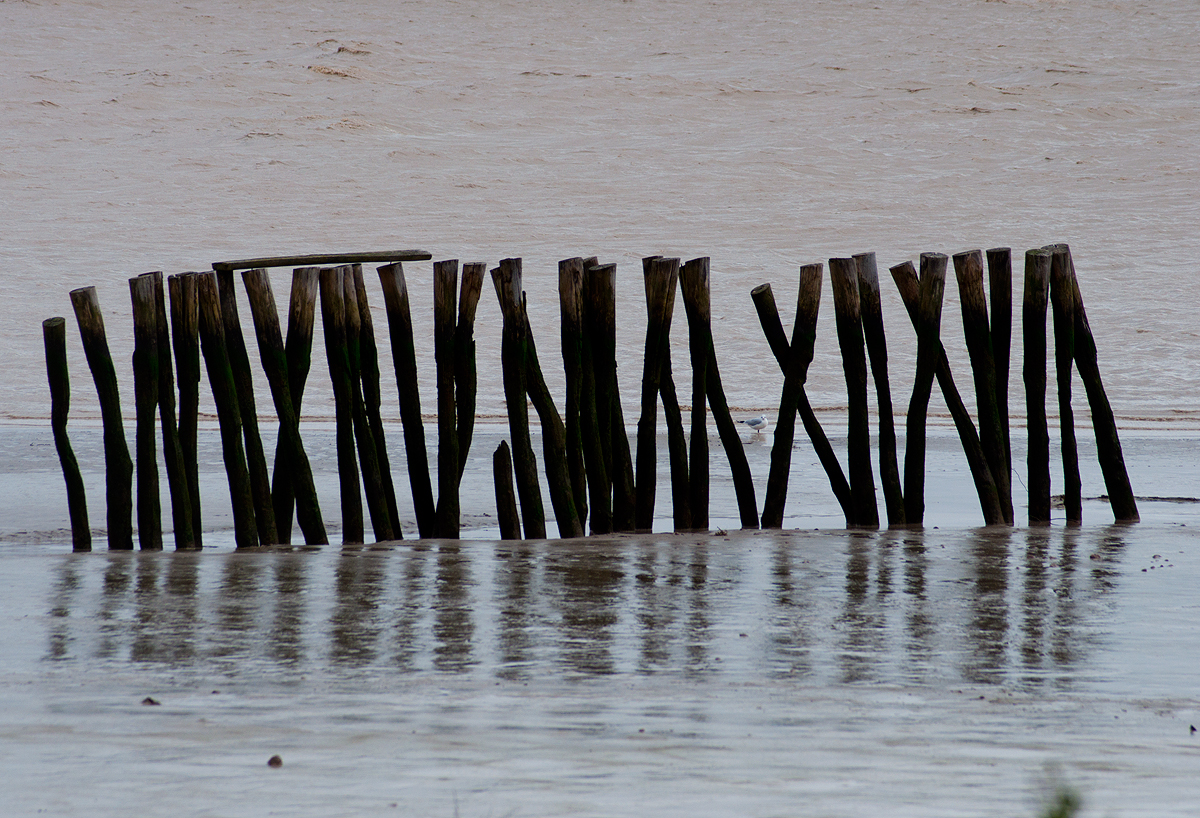 El agua, el barro y las maderas de la orilla dibujan combinaciones que pueden parecer muestras de arte abstracto