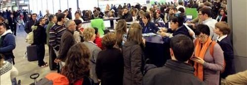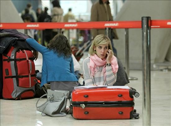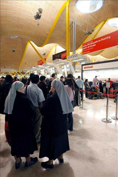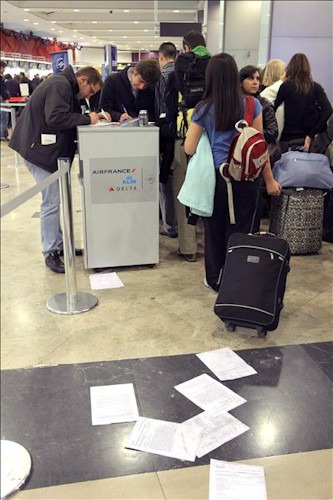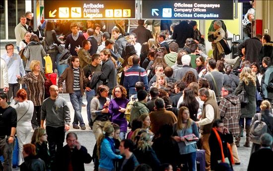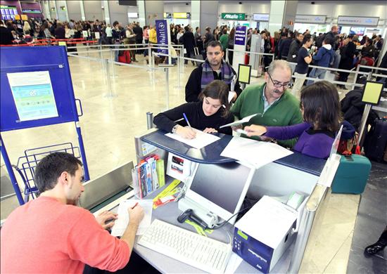 Decenas de turistas hacen cola en los mostradores de una compañía aérea esta tarde en el aeropuerto de Madrid-Barajas con motivo del inicio del puente de la Constitución. El aeropuerto de Barajas se encuentra en situación "rate cero", lo que significa cerrado a las operaciones de aterrizaje y despegue, tras haber abandonado los controladores sus puestos de trabajo.