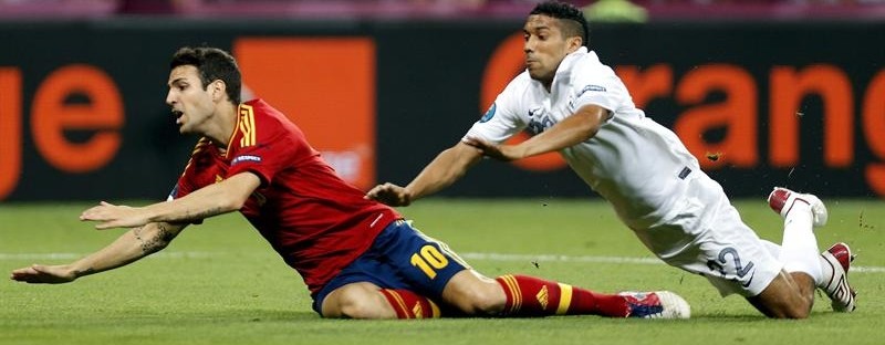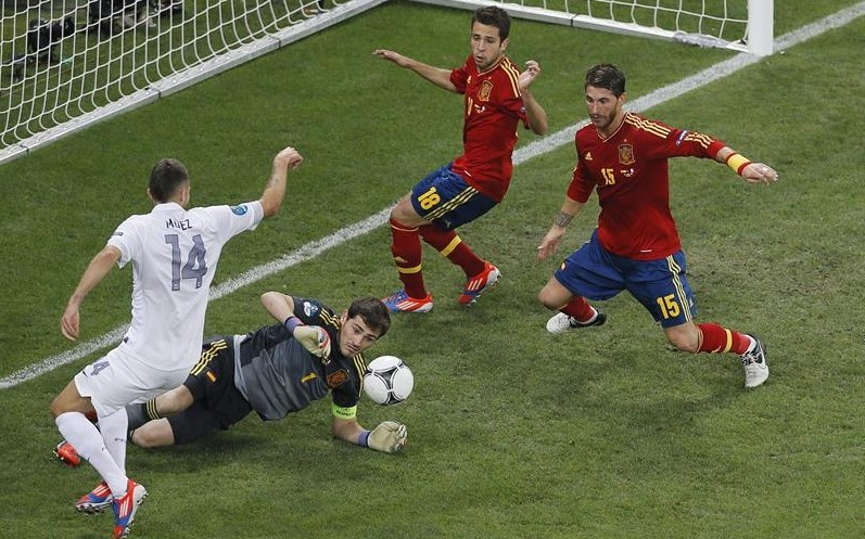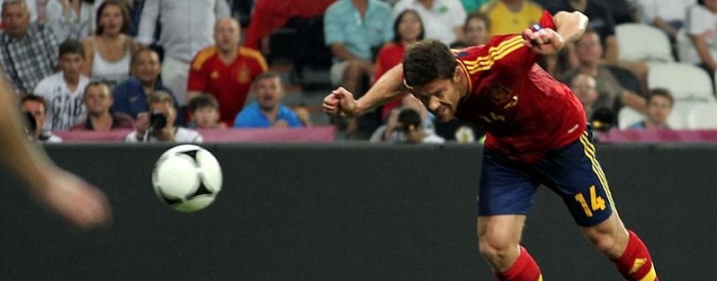 Xabi Alonso, en su partido número 100 con España, anota el primer tanto del partido de cabeza, ajustando su remate al poste.