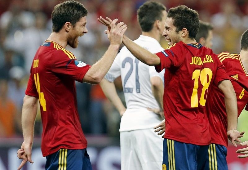 Xabi Alonso (i) celebra su gol, el primero de su equipo, junto al defensa Jordi Alba (d).