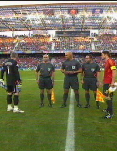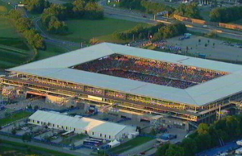 Vista área del estadio Wals-Siezenheim, justo en el momento en el que los dos equipos se preparan para escuchar los himnos nacionales. (Cuatro)