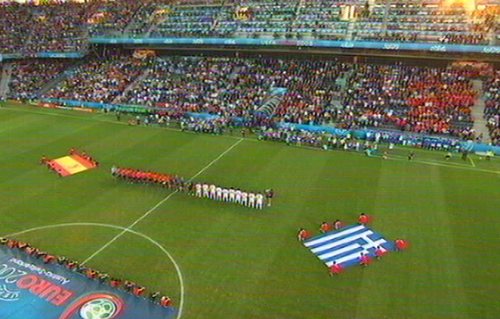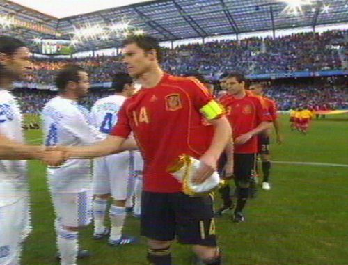 Los futbolistas de los dos equipos se saludan antes de que diera comienzo el encuentro. En primer término, Xabi Alonso (d), que ejerció de capitán de España, da la mano a un jugador griego. (Cuatro)