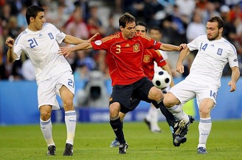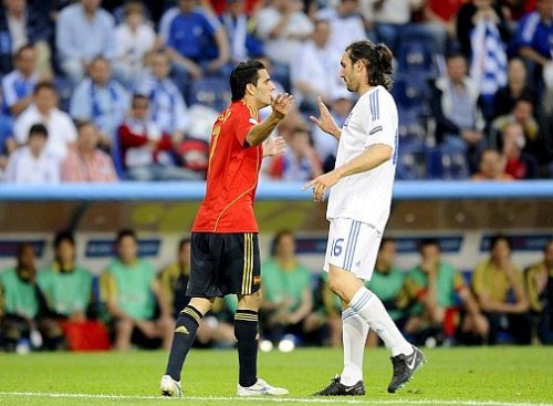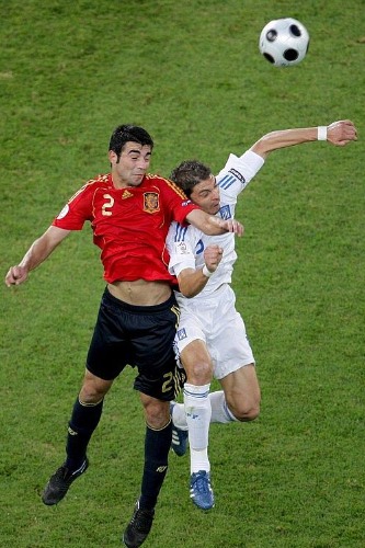 Raúl Albiol (i) pelea por un balón con el delantero Angelos Charisteas. (EFE)