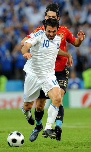 Juanito (i) trata de despejar el balón ante Charisteas. (EFE)