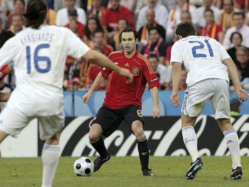 Andrés Iniesta (c) encara a Kostantinos Katsouranis (d) ante la mirada de Sotirios Kirgiakos. (EFE)