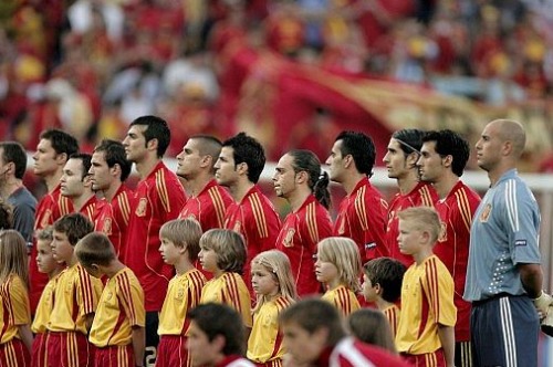 Los suplentes de la selección española, sobre el césped del estadio Wals-Siezenheim, se emocionaron al escuchar el himno. (EFE)
