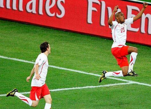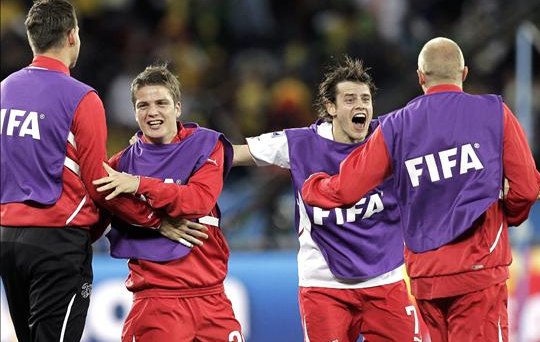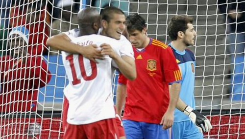 El suizo Gelson Fernandes (d) celebra el 1-0 contra España durante el partido del grupo H del Mundial de Fútbol Sudáfrica 2010 que las selecciones de España y Suiza.