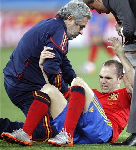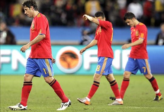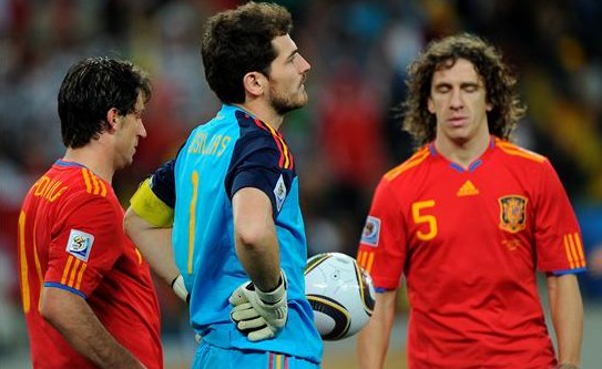 Los jugadores de la selección española Joan Capdevilla, Iker Casillas y Carles Puyol se lamentan tras el gol de Suiza durante el partido del grupo H del Mundial de Fútbol Sudáfrica 2010 que las selecciones de España y Suiza.