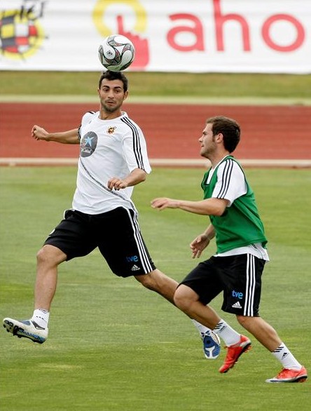 Los valencianistas Raúl Albiol y Juanma Mata, durante un entrenamiento en La Ciudad del Fútbol de Las Rozas. (EFE)