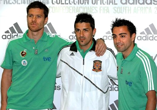 De izquierda a derecha, Xabi Alonso, David Villa y Xavi Hernández posan ante los medios con la nueva equipación de la selección española. (EFE)