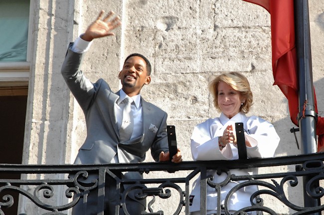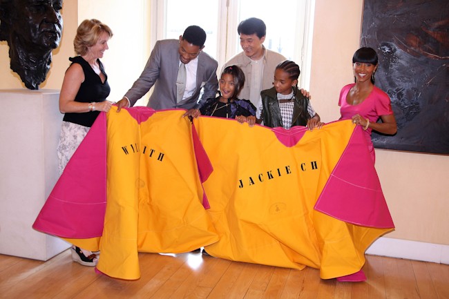 Esperanza Aguirre ha regalado a los actores Will Smith y Jacke Chan sendos capotes con sus respectivos nombres. Los actores se encuentran en España para promocionar su última película "The karata Kid" (en la que los protagonistas son el hijo de Will Smith y Jackie Chan, siendo Will Smith el productor).
