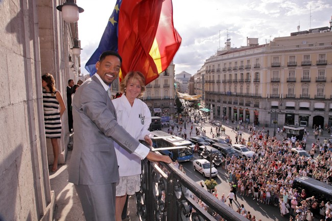 La presidenta de la Comunidad de Madrid no tuvo problemas para salir al balcón de la Real Casa de Correos con el Karategui que le regalaron los actores. En la fotografía, aparece junto a Will Smith.