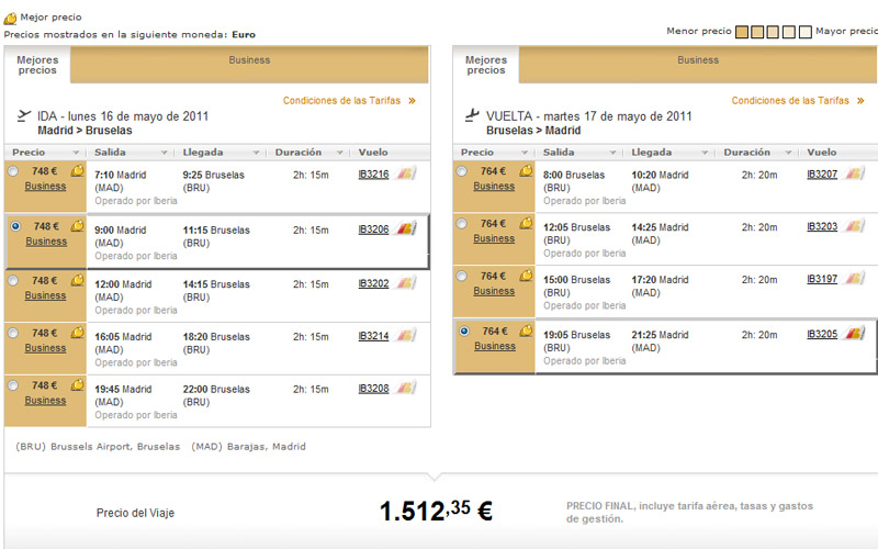 El precio de un billete en business a Bruselas con Iberia cuesta 1.512,35 euros.