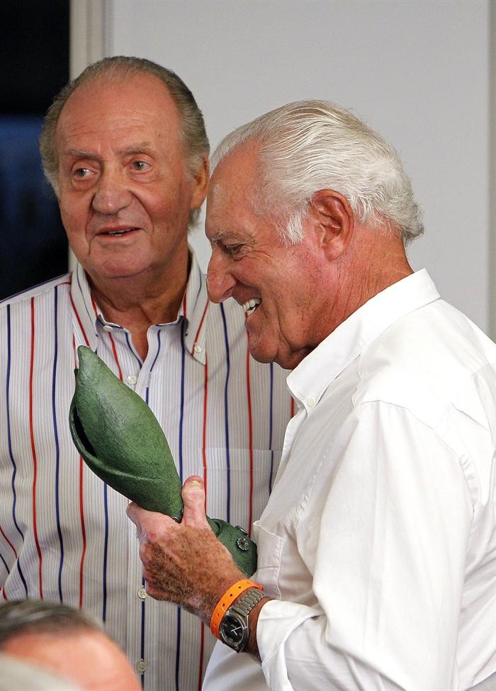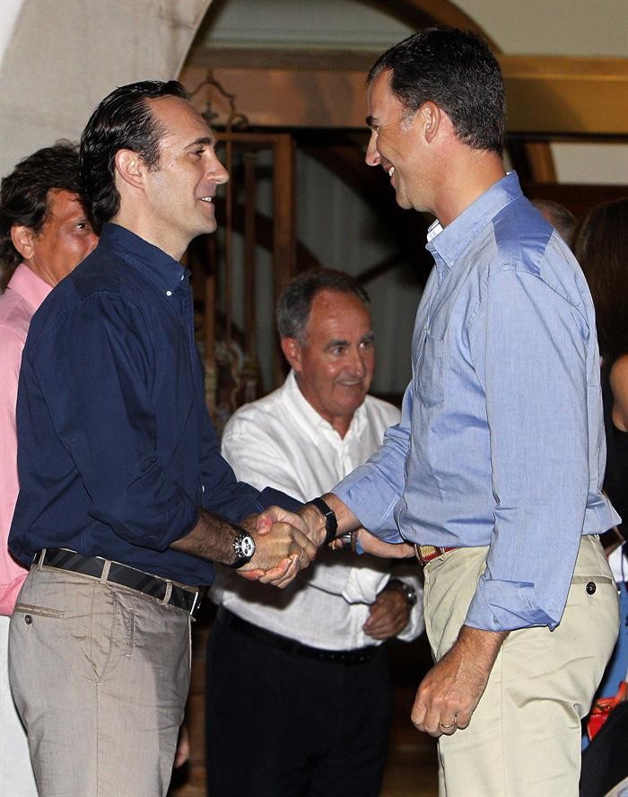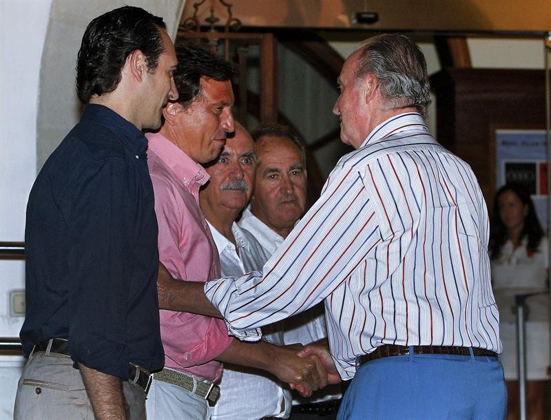 El Rey Juan Carlos saluda al alcalde de Palma de Mallorca, Mateo Isern, en presencia del presidente del gobierno balear.