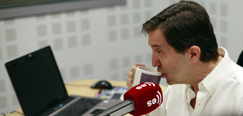 Federico Jiménes Losantos da un sorbo a la taza de café cinco minutos antes de comenzar el programa.