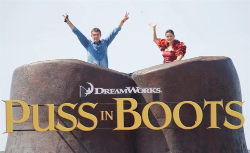 El actor español Antonio Banderas (i) y la actriz mexicana Salma Hayek (d) posan durante el pase gráfico de la cinta de animación de Dreamworks 'Puss in Boots', el spin-off de la saga Shrek, con el Gato con Botas como protagonista.