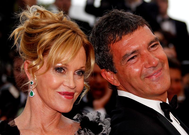 El actor español Antonio Banderas y su mujer, la actriz estadounidense Melanie Griffith, posan para los medios a su llegada a la proyección de "Midnight in Paris", película de Woody Allen que ha inaugurado fuera de concurso la 64 edición del Festival de Cine de Cannes