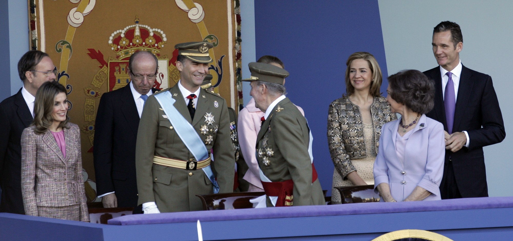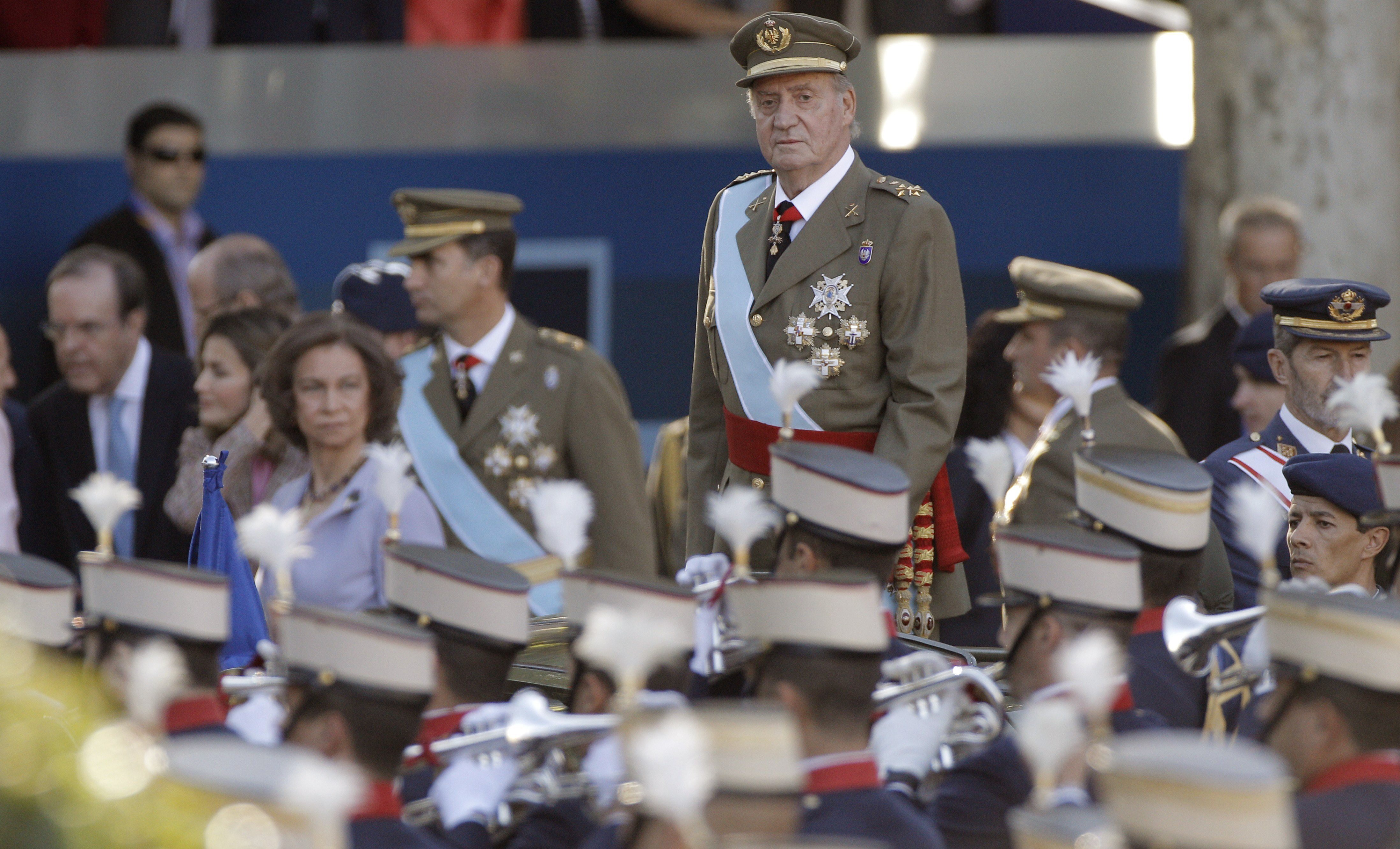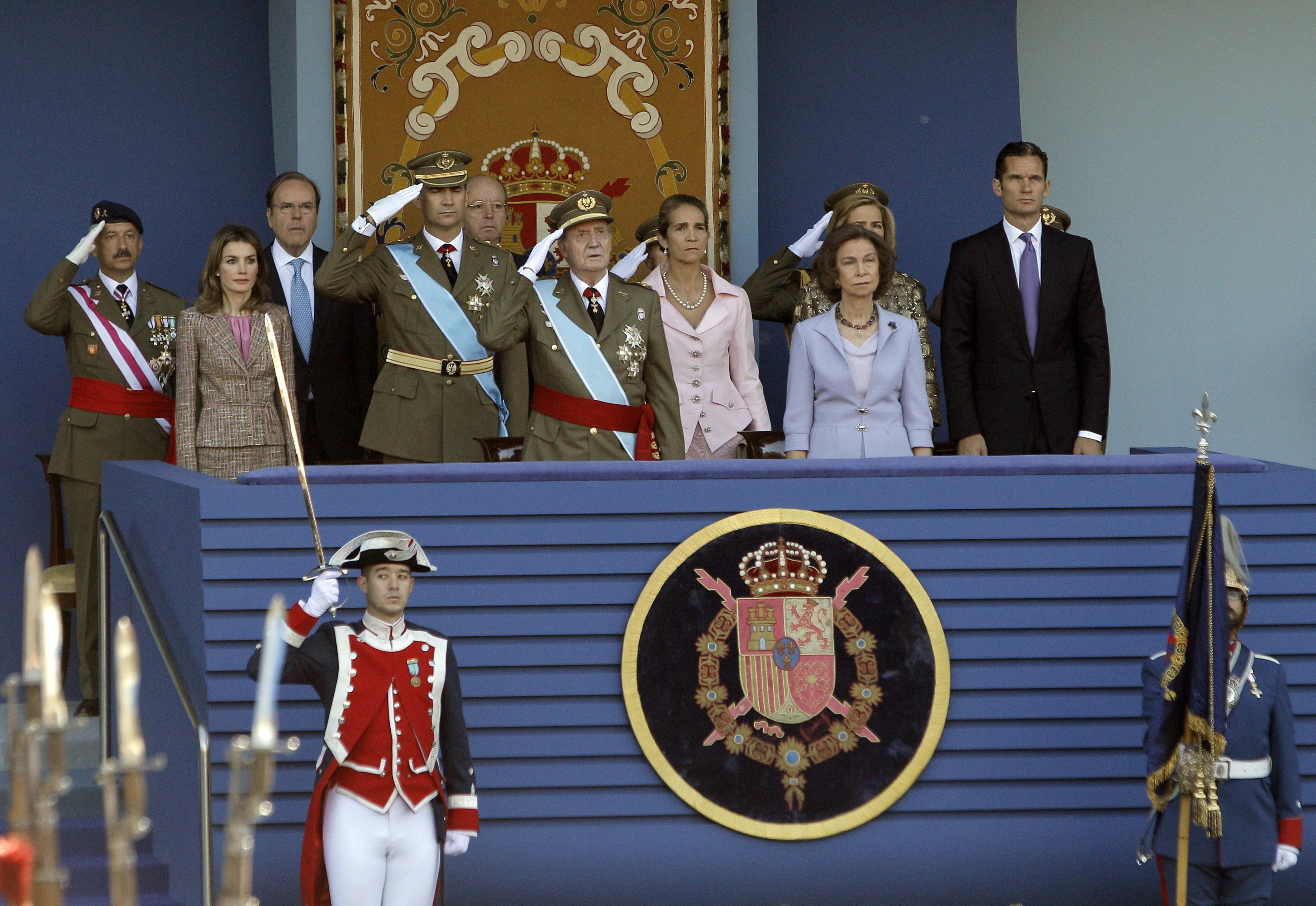 Los Reyes, los príncipes de Asturias, la infanta Elena y el duque de Palma, en el palco de autoridades del desfile militar de la Fiesta Nacional, hoy en Madrid. EFE/JuanJo Martín