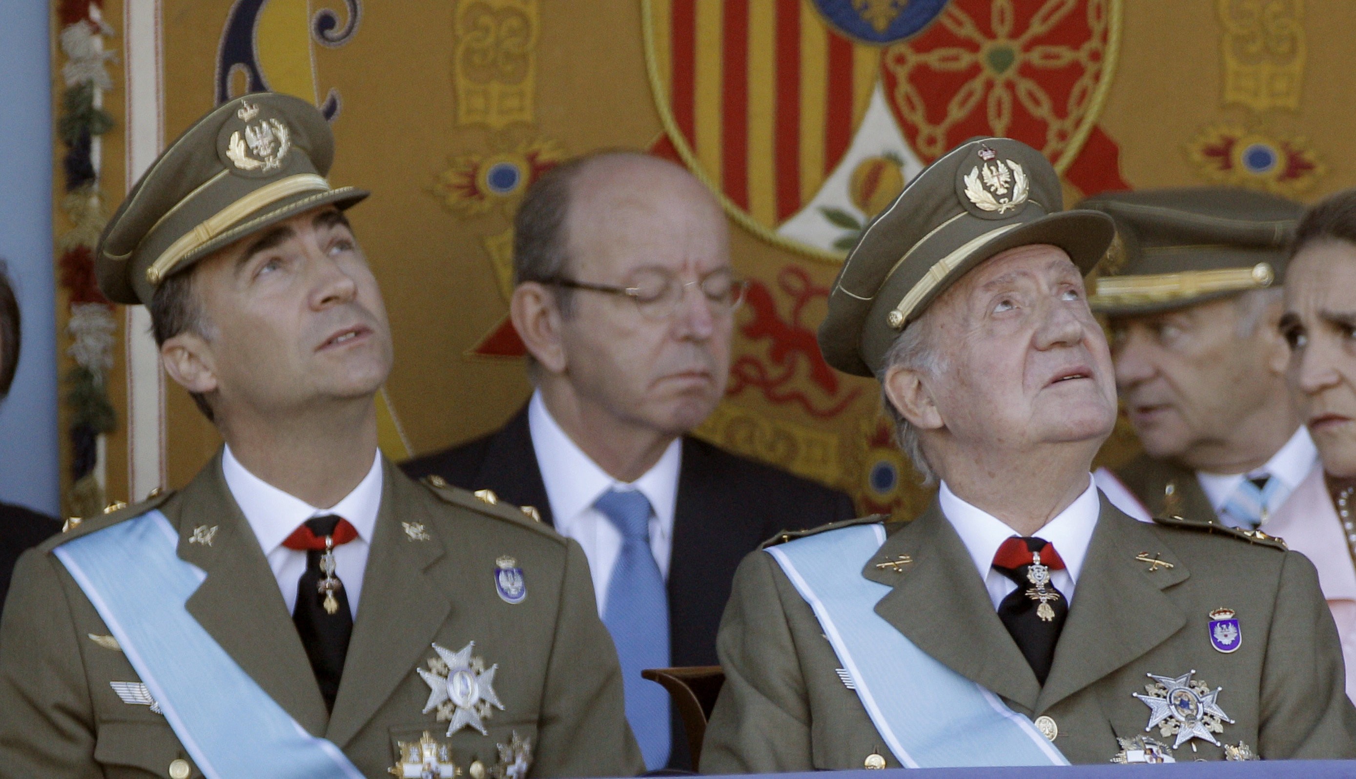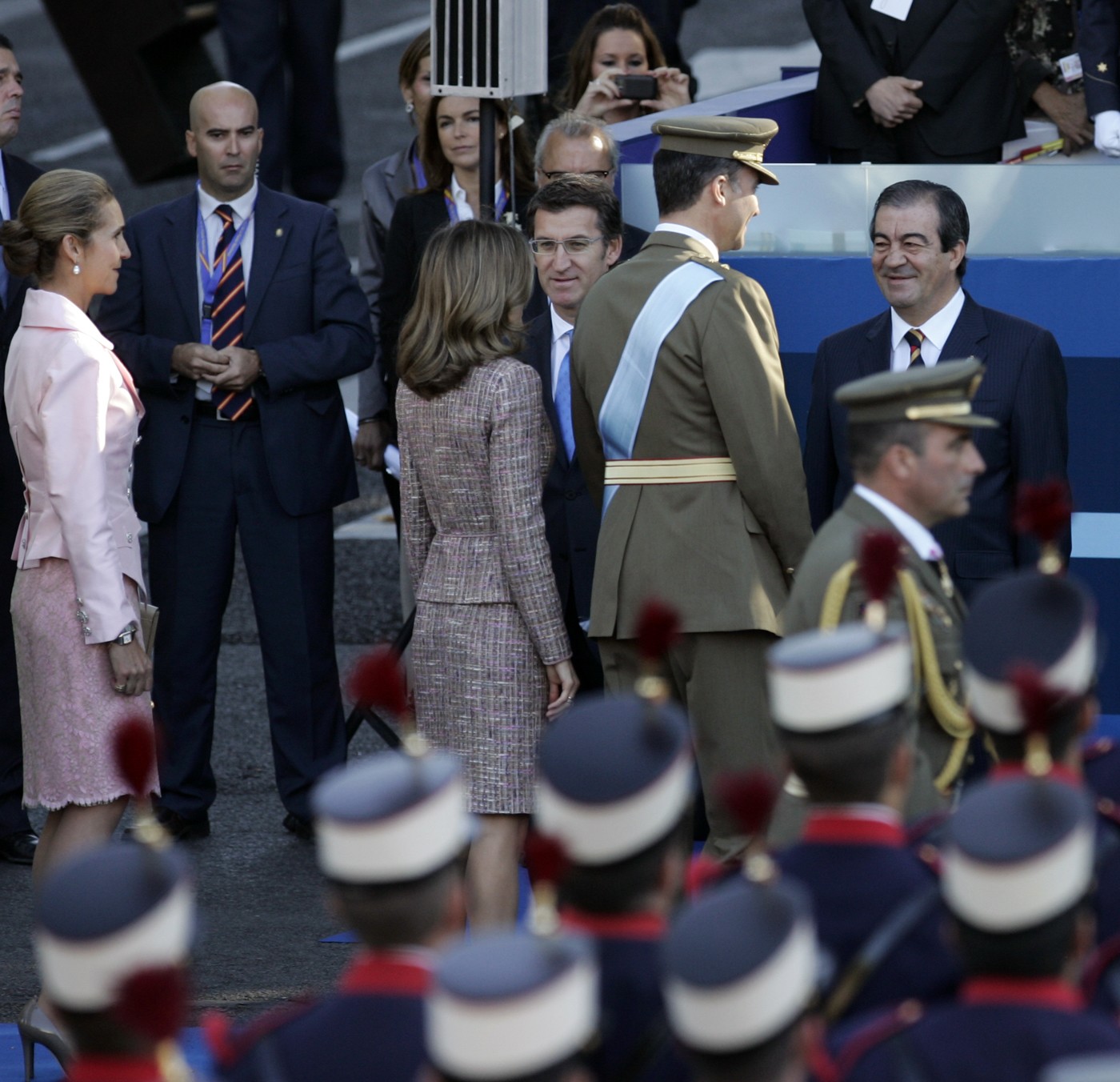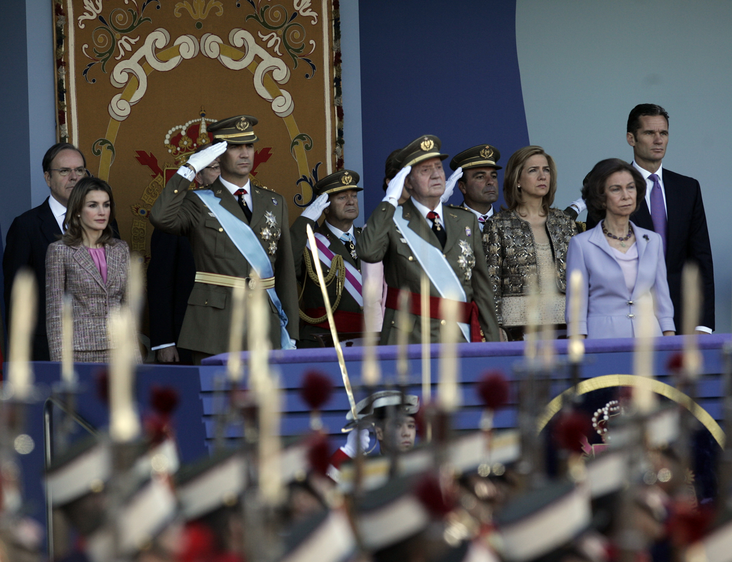 Los Reyes, los príncipes de Asturias, la infanta Elena y el duque de Palma, en el palco de autoridades del desfile militar de la Fiesta Nacional, hoy en Madrid. EFE/JuanJo Martín