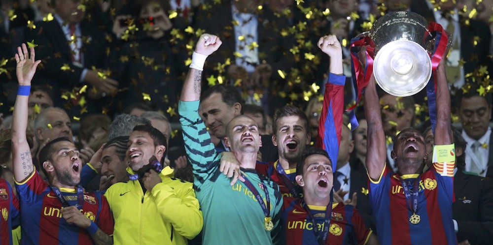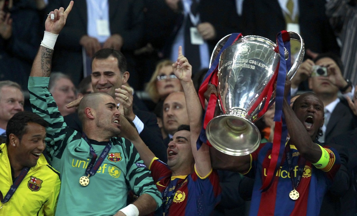 Abidal, junto con Xavi y Víctor Valdés, levanta la cuarta Copa de Europa del Barcelona. Detrás, el Príncipe Felipe aplaude a los campeones.