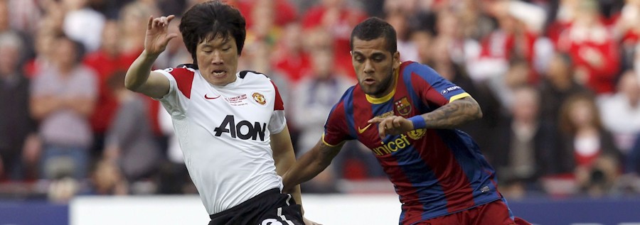 El surcoreano Park Ji-Sung intenta arrebatarle el balón al incombustible Dani Alves.