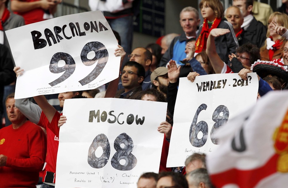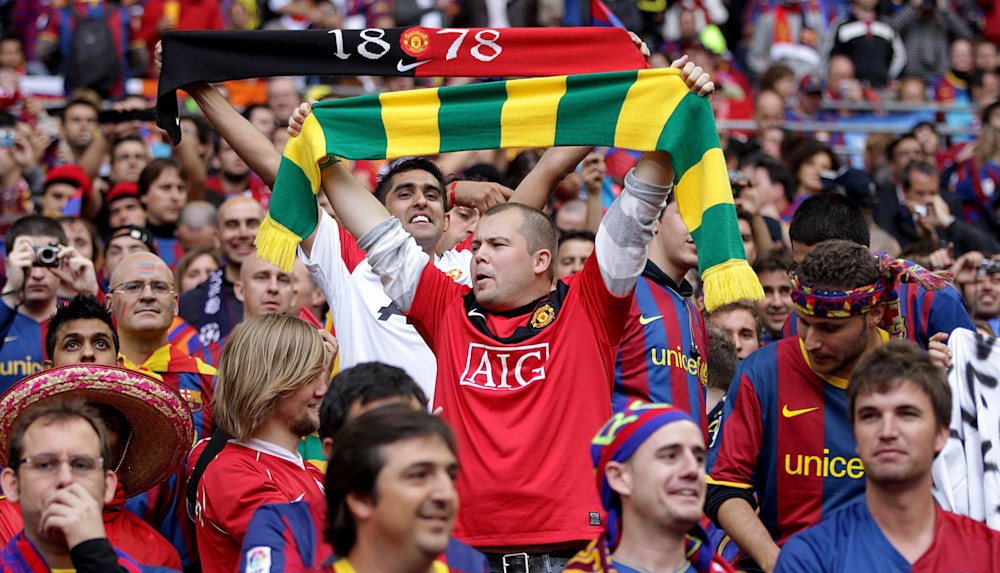 Unos aficionados del Manchester United animan a su equipo entre la marea culé en el estadio de Wembley.