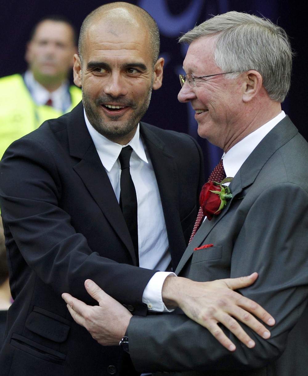 Sir Alex Ferguson y Pep Guardiola se dan un caluroso abrazo antes del comienzo de la final.