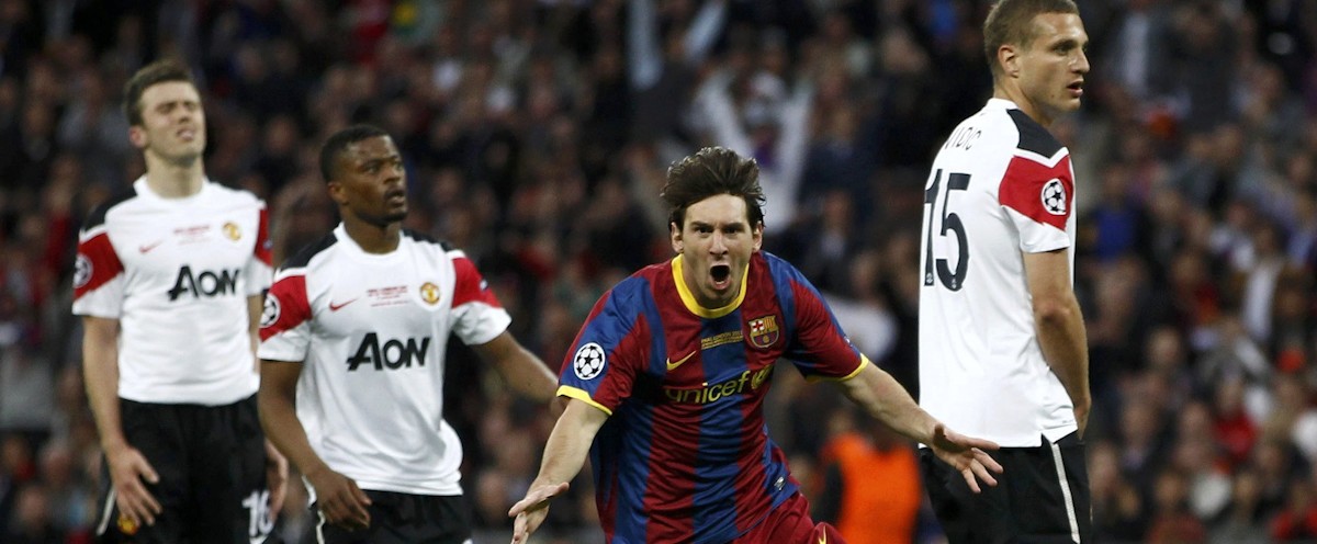 El mejor jugador del mundo celebra el segundo tanto del Barcelona ante la decepción de la defensa del Manchester United.