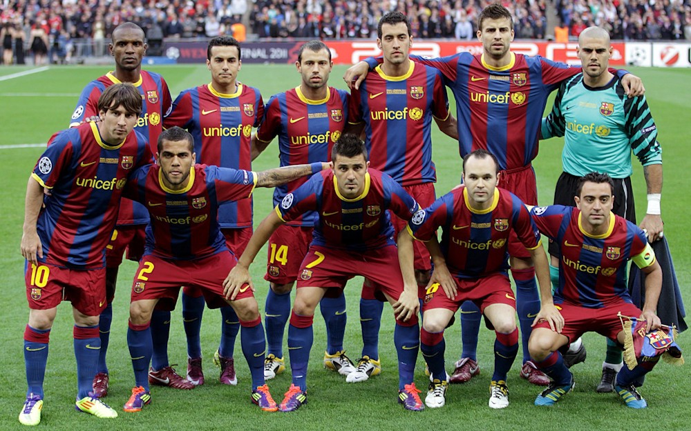 Ésta es la alineación del Barcelona en la final de Wembley que pasará a la historia. De arriba a abajo y de izquierda a derecha: Abidal, Pedro, Mascherano, Busquets, Piqué, Valdés; Messi, Dani Alves, Villa, Iniesta y Xavi.