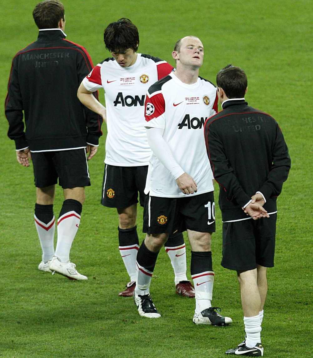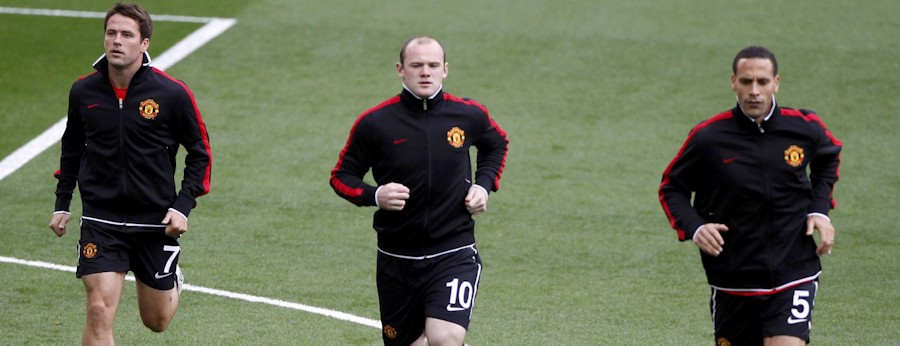 Los jugadores del Manchester United Rooney, Ferdinand y Owen calientan en el césped de Wembley antes de la gran final de la Champions.
