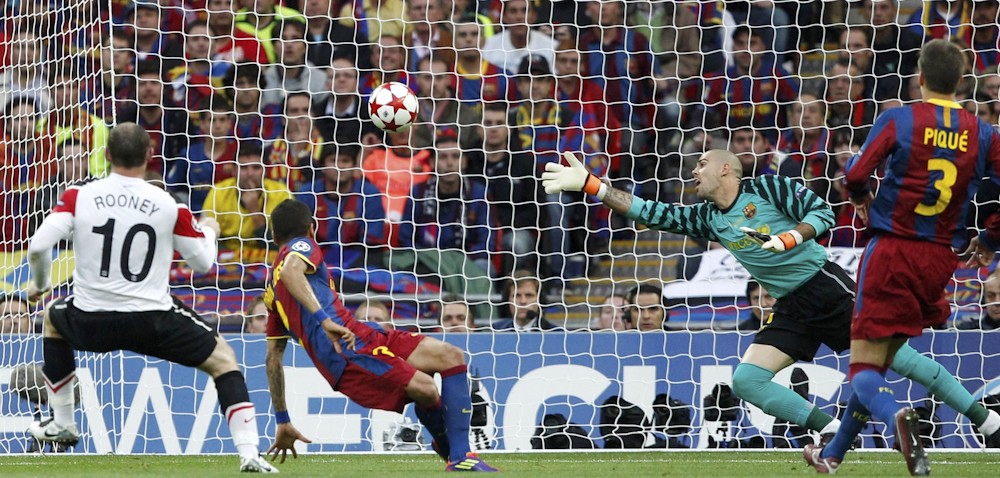 Después de una pared con Ryan Giggs, en posible fuera de juego, Wayner Rooney anota el tanto del empate ante la estirada imposible de Víctor Valdés.