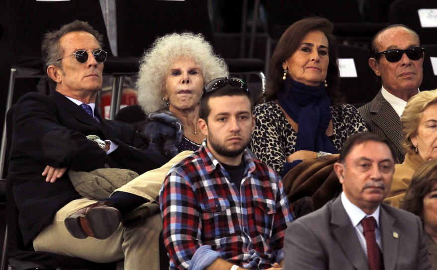 La duquesa de Alba (2i) y su esposo Alfonso Díez (i), el extorero Curro Romero (d) y su esposa Carmen Tello, asistieron a la final de la Copa Davis. EFE/Julio Muñoz.