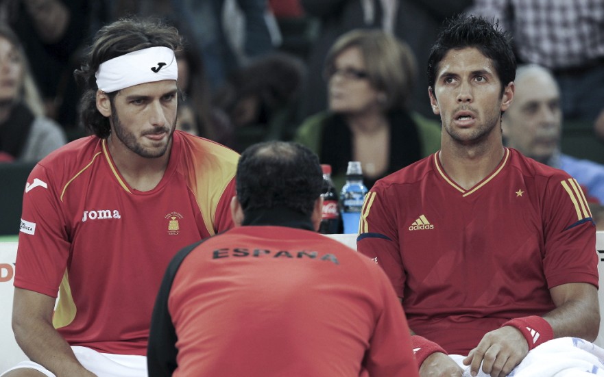 Fernando Verdasco (d) y Feliciano López reciben instrucciones del capitán Albertt Costa. EFE/Julio Muñoz