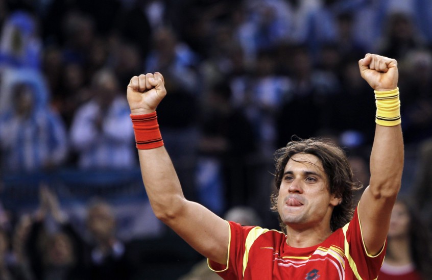 El tenista argentino David Nalbandian, que forma pareja con Eduardo Schwank, celebra la victoria frente a los tenistas Feliciano López y Fernando Verdasco, en el tercer partido de la final de la Copa Davis. EFE/Julio Muñoz