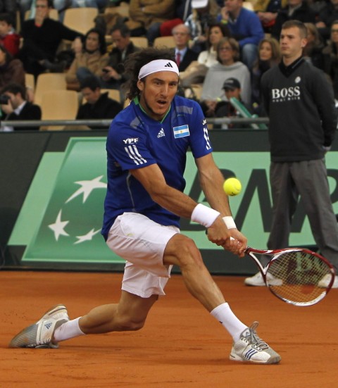 Juan Mónaco devuelve una bola en el primer partido de la final contra Rafael Nadal. EFE/Julio Muñoz