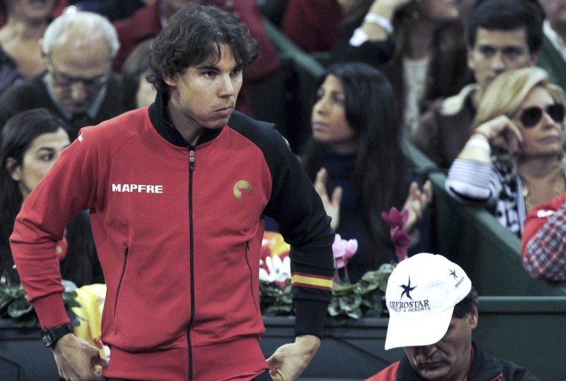 Rafael Nadal sigue el encuentro de dobles de sus compañeros Fernando Verdasco y Feliciano López frente a los argentinos. EFE/Julio Muñoz