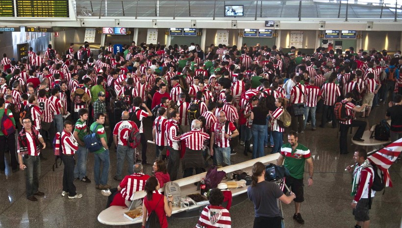Cientos de aficionados del Athletic de Bilbao esperan en el aeropuerto vizcaíno de Sondica los vuelos que les llevarán a Bucarest.