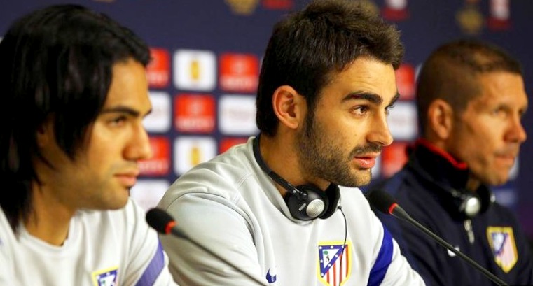 El entrenador del Atlético de Madrid, Diego Simeone (d), habló en rueda de prensa junto a los jugadores Adrián López (c) y Radamel Falcao.